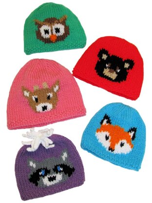 Featuring popular woodland critters, these cute hats are fun for kids of all ages! Knit a Deer, Black Bear, Fox, Owl and Raccoon. These darling Forest Friend Hats feature some simple intarsia in circumference sizes for Baby (14-15 in / 35-38 cm), Toddler, (16-17 in / 40-43 cm) and Child (18-19 in / 45-48 cm). Knit flat in stockinette stitch with a simple seed stitch border, this small project is perfect for even first-timers to try their hand at color-change/intarsia knitting! Optional Knit Pompom instructions included.