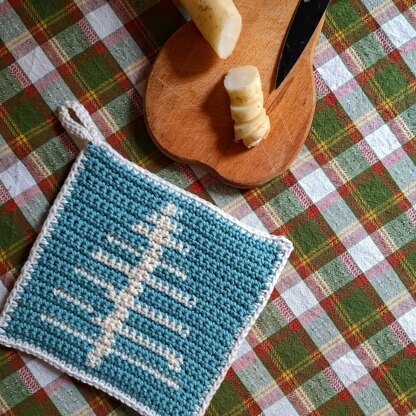 Easy to follow, both written and graphic crochet pattern with pictures to make this beautiful squishy potholder with simple graphic motif of a coniferous tree.