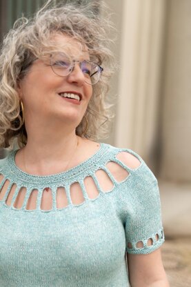 Formentera es una camiseta de verano muy ligera que te recomiendo tejer con una fibra muy fresquita. Su construcción es muy sencilla: se empieza por el cuello y se teje hacia abajo, comenzando por un canesú redondo con unos calados muy fáciles pero muy originales. Al llegar a la zona más ancha del pecho, se separa el cuerpo de las mangas, que quedan en espera. Se continúa el cuerpo recto y se remata con un sencillo punto bobo. Las mangas en espera también llevan el mismo calado que el canesú, pero más pequeño.