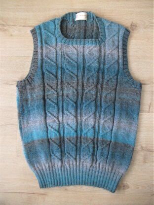 A smart, unisex tank top for all seasons. Worked in a lovely light-weight, random dyed yarn, with vertical panels of “travelling” cables which look really striking. All the borders are in rib and add a neat finish.