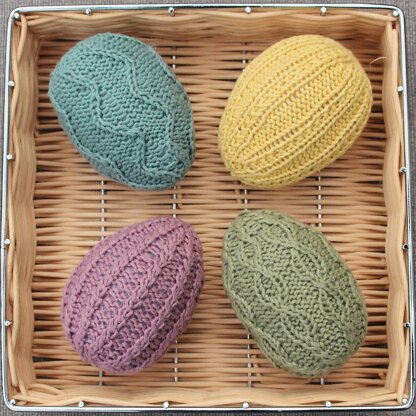 The Eggs are knitted in the round (use double pointed or circular needles) and shaped with knitting increases and decreases.