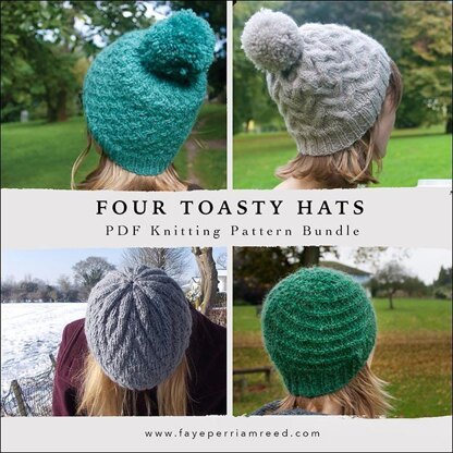 Four cosy, unisex hat patterns, three in worsted weight and one in chunky, all available in one little ebook bundle.