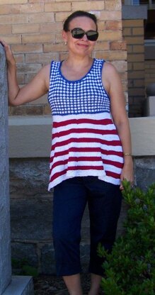 The Fourth of July tank has a baby-doll shape -it will flatter any body. The yoke part in blue-white star pattern is designed with 1” negative ease. The front and back of the yoke are worked back and forward from bottom to top.The shoulders are seamed using three- needle method.The side seams are worked using a mattress stitch.Then the stitches are picked up at the bottom of the yoke and knitted from top down using the short rows technique.
