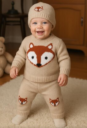 Small fox faces are featured on the trousers and hat with a larger fox face on the front of the sweater. The pattern has large, coloured charts for the foxes and colour coding for the different sizes.