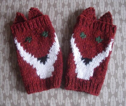Fox Face fingerless gloves/mitts in DK wool with fox’s face and ears on the front. The backs of the mitts are plain. The mitts in the photograph were knitted in Rowan Tweed DK pure wool, colour Bainbridge, but any DK weight wool could be used. About 40gm of the main colour is needed, plus a small amount of white for the fox’s chest and oddments of black and green for the nose and eyes. The fox is knitted using the intarsia method, but the mitts could be knitted plain and the contrast colours worked in duplicate stitch afterwards. The ears are knitted separately and sewn to the top of the mitts, behind the top ribbing.