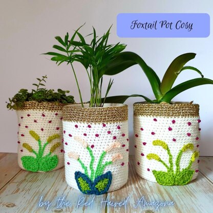 This digital pattern will show you how to create a fresh, cream coloured pot plant cover/ cosy which is decorated in a foxtail-catkins motif with luscious little french knots. There are full instructions in how to crochet the cosy, the leaves, catkins, stems and how to embroider the french knots.