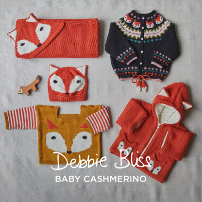 Spoil your little one with the Foxtastic Layette by Debbie Bliss. Knitted in Baby Cashmerino, this collection includes an adorable cardigan, sweater, hooded coat, hat, and a hooded blanket to keep your baby snug. With patterns featuring intarsia and Fair Isle, all charted for ease, the charming fox face motif runs throughout the collection. It is designed in Debbie Bliss Baby Cashmerino and is machine washable for easy care and irresistibly soft for baby's comfort. Watch as these become your baby's cherished favorites!