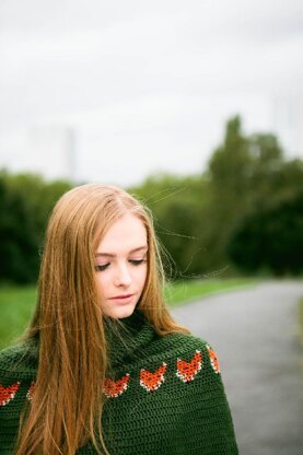 I had the idea for the colour work foxes long before I knew what to do with them. After much deliberation I decided on this cape, a perfect accessory to ward off chills, without the bulk of a sweater. You can also pull it up on to the tops of your shoulders and wear it just as a cowl.