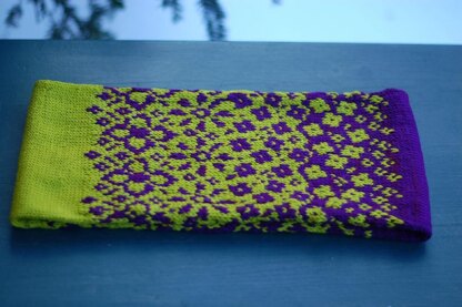 The cowl is worked by first casting on stitches with a provisional cast on, and knitting entirely in the round following color charts. The end of your knitting is then grafted to the cast on stitches using the Kitchener Stitch.