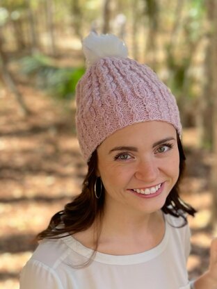 Tiny cable ribbing flows into a squishy cable combo pattern that is fun to knit and super wearable. The Fraise Hat looks great with or without a pompom, but I love the faux fur one on this!