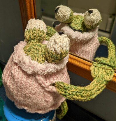 Fran, a frog in a sweater. Finished at around 6" / 15 cm tall.