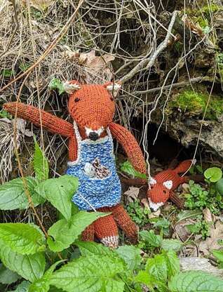 Frances and her baby fox are knit in the round, all parts (head, body, legs, arms, ears, tail) separately and sewn together. The apron is knit flat, with I-cord edge and string. Snack food (mice, hen) are both knit in one piece. When casting on leave a longer tail to be used for sewing.