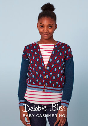 Frank is our personal favorite in Debbie Bliss' new collection, Tweens. We love Frank's cool baseball jacket shape and fabulous leopard print intarsia! Jazz it up with your own colors and buttons and pair with jeans, tulle skirts, shorts or a dress. Knit flat and seamed in gorgeously soft Debbie Bliss Baby Cashmerino, with 50 shades to choose from, this jacket is bound to be a tweeny hit!