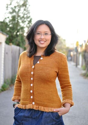 Fred+Ginger is a sophisticated fitted cardigan with set in, three quarter length sleeves and softly ruffled edges. The lightweight ruffle is worked in dyed to match cashmere silk laceweight for a fun feminine twist on the basic cardigan. Twisted ribbing completes the buttonbands and collar. Fred+Ginger is a bottom-up cardigan, with the body worked in one piece to the armholes then the upper fronts and back worked separately. The 3/4 length sleeves are knit in the round to the underarm, then worked flat for the sleeve cap, and seamed to the body. Buttonbands and collar are picked up and worked after the body is complete, and then the ruffle is picked up and worked in a complementary lightweight yarn. Shown in size 37” / 94cm with no ease.