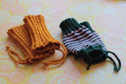 DK weight leg-warmers for babies; these legwarmers are designed to keep little legs warm during nappy-free time, or while being worn in a sling or carrier. An i-cord drawstring tied at the ankle keeps the legwarmers in place in spite of kicks or wriggles. Knit in next-to-skin soft yarn for semi-naked baby time, or in a rougher wool as an outer layer while baby-wearing.