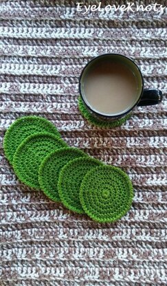 - Yarn Alternatives: Berroco’s Weekend Yarn; several strands of #10, #5 or #3 Cotton Thread Held Together. One skein makes 10 coasters.