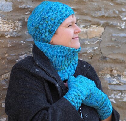 Traditional intertwining cables and ribbing run the length of cowl. Fresta hat and fingerless mitts are also available.