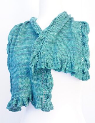 This scarf is knitted flat, with a simple but effective ruffle and reversible cable edging.