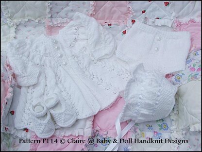 Knitting pattern for a pretty frilled matinee coat with pants, bonnet and shoes.