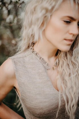 The top is worked seamlessly from the top down in the round. Neckline stitches are cast-on provisionally, shoulders and neckline shaped using short rows and lifted increases. Each front shoulder worked separately to the start of the neck opening, then joined together and worked straight to underarm. Back is worked down to underarm, joined with the Front and the body is worked in the round down to the hem. The collar is knitted on last.