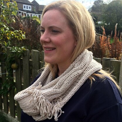 Knit in Chunky cotton mix yarn with a bold stand out feature cable that looks equally good on the wrong side of the cowl. No seam to join, just finish the cowl with a super fringe.