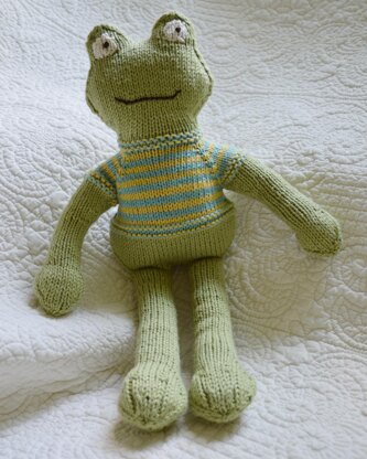 Froggie and sweater are knit complete all in one piece and stuffed as you go. Starting at the neck with provisional cast-on the head is knit first eyes are knit and face detail embroidered on. The stitches at neck are picked up and the rest of the frog is knit top-down, in-the-round.