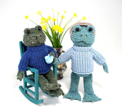 The toy uses worsted/aran weight yarn on 4 mm needles, and the pullover and cap use fingering or sport weight yarn on 3.25 mm needles