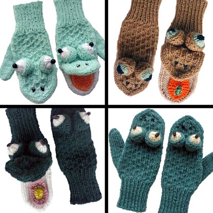 This final pattern includes basic frog mittens, frog mittens with a open mouths and the original frog hand puppet. Various sizes from 4 years old to XL adult are determined by your choice of yarn. For example, choose a worsted weight yarn for an adult size, or a sport or baby sport weight for a child.