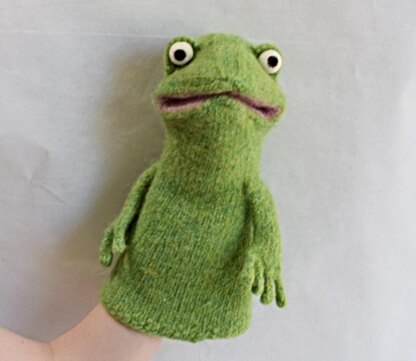 Quirky Frog Puppet will add a little humor to your puppet play! Knit in the round from the bottom to the top, he is felted in either in a washing machine or dryer. Makes an durable, heirloom quality gift. Fits up to an adult hand.