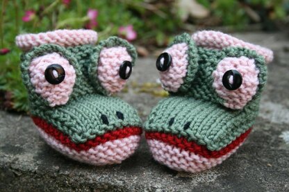 These hopping mad booties will liven up any baby's outfit and will be sure to make other babies green with envy! This is a detailed knitting pattern with row by row written instructions and photographs to help you along the way. The booties are knit flat on two needles using DK yarn. They have a garter stitch sole, stocking stitch instep and a garter stitch cuff with roll edge. The eyes are knit separately and sewn on upon completion and the nostrils are embroidered using straight stitches.
