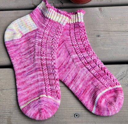 These shortie socks are frothy and so fun to knit. They are knit toe up using simple one over one cables and a lace panel that make this an engaging knit. It is only a four round repeat and two of those rounds are plain knitting which makes this the perfect on-the-go summer sock. The ruffled bind off is a unique little addition to this very cute sock and is surprisingly easy to do