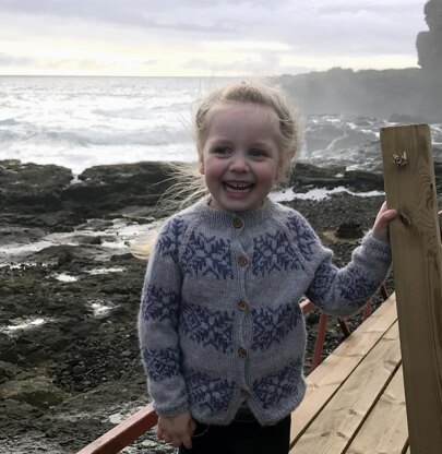 This cardigan is inspired by the Faroese sweaters, with two colour fair isle pattern in stripes, in one main colour and one contrast colour. I was inspired by our cold and long winters in the Faroe Islands, when I designed the pattern for this cardigan. The name Frost is an international word as well as a Faroese word.