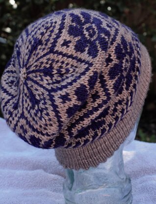 Frost Petals is knitted in the round using stranded colorwork. It features a picot hem for the brim of the hat (This creates a doubled fabric that will keep your ears nice and toasty when cold winds blow), and a Latvian braid.