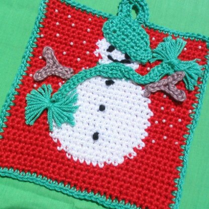 The fourth potholder in my Christmas series, here is Frosty the Snowman, wrapped up nice and warmly in his beanie hat and fringed scarf. He needs to be warm, it's snowing!