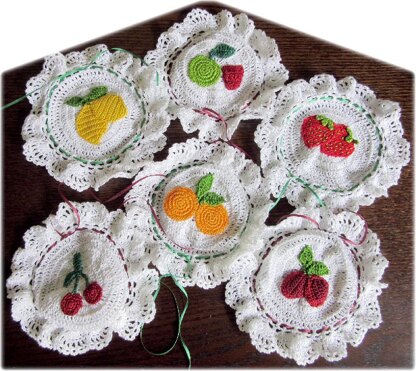 A set of jam/marmalade jar covers with instructions for 8 fruits (lemon, orange, apple, plum, strawberry, cherry, raspberry and blackberry) included in the pattern