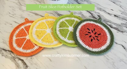 Crocheted fruity potholder/hotpad pattern. Pattern is for the orange slice, lemon slice, lime slice, and watermelon slice. They measure approximately 8 to 8 1/2 inches in diameter.