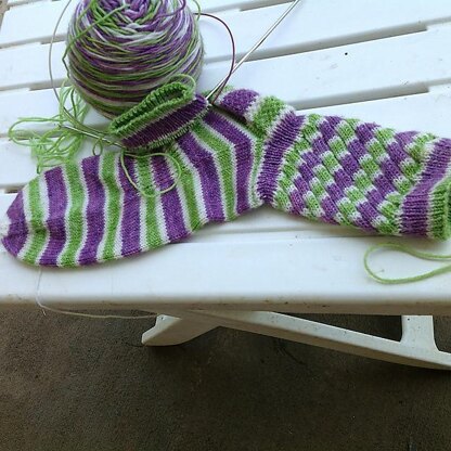 The pattern on this cuff reminds me of Fruit Stripe Gum! This fun pattern is an easy one-row repeat that makes your self-striping yarn appear as a diamond shaped pattern. Fun color play! Easy pattern repeat, fitted sole, staggered diamond heel flap and rounded toe.