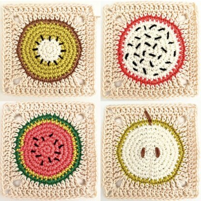 4 Fruits Granny Square Pattern : Kiwi, Watermelon, Dragon Fruit and Apple - with Diagram - In English