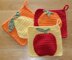 These colorful potholders are easy to make with mostly simple single crochet stitches. Make the background squares first and then make the fruit and leaves and sew them onto the squares to create a double thickness in the center of the potholder.