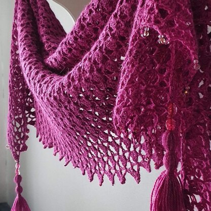 This stunning reversible shawl is named after the beautiful showy flowers and the varying shades of pinks, fuchsia, magenta and deep pinks in these blooms.. Border is worked at the same time as the body making this an adjustable shawl .