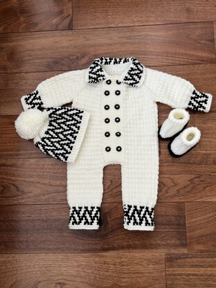 A beautiful 3 piece romper set, knitting pattern which is ideal for either a boy or girl. The Romper is knitted flat from the top down on straight needles and the button bands are worked as you go, (so no awkward picking up of stitches is required to make this romper set).