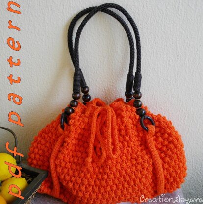 This fashionable, up-to-date bag is certain to catch the attention of all ; you're sure to be asked where you bought it. Yarn:80% cotton-20% acrylic, category light worsted, «Kotoline» by Kangaroo 100gr (3.5 oz)/250 m (273,5 yds): 4 skeins in orange. Needles: US 6 (4mm) circular, dpn US 6 (4mm). Adjust needle size to obtain correct gauge Notions: tapestry needle, stitch holder,fabric for lining, matching sewing thread, a pair of brown leather-wood braided handles, 30 “ (76 cm) long (end to end) , sewing needle, sewing machine,. Gauge: 18 sts x 32 rows = 10x10cm, in bobble pattern, 19 sts x 29 rows in stockinette stitch. Level: intermediate requires knowledge of knitting and purling, picking up stitches, working in the round on circular needles, and some simple hand-sewing.