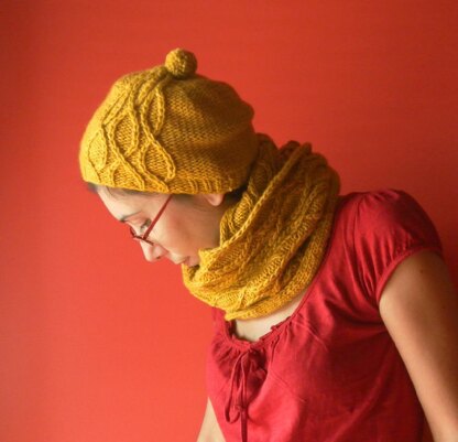 Cowl: the central panel is worked in purl free slipped sts pattern, the loop is worked in twisted cables (without cable needle!).
