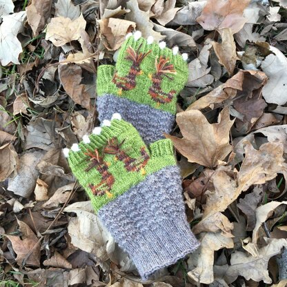The cuff is worked with twisted stitches for a clean look. Bobbles along the cuff edge resemble eggs. The textured base of hand stitch pattern represents chicken wire fencing. Optional head feathers are added as an embellishment.
