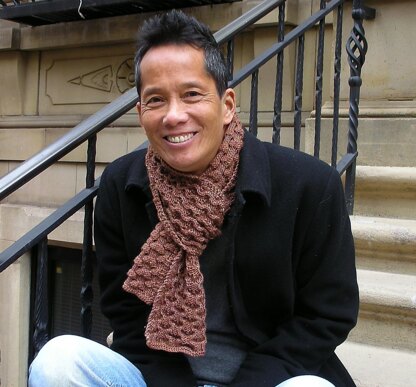 Here's a unisex scarf that's completely reversible. One side looks like embossed serpentine stitches, and the other side looks like a highly textured basketweave.