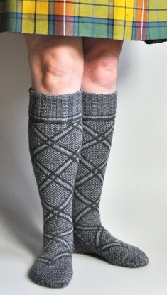 This is a traditional kilt stocking pattern from Gairloch, Wester Ross, Scotland. The ‘Gairloch pattern’ was used for stockings in the main but was also widely applied to waistcoats and other garments. Normally employing two shades of wool, the pattern could be more elaborately coloured but the design remained standard.