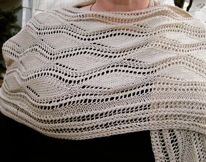 This lovely easy lace shawl can look elegant in silk, fuzzy in mohair, or simply fun, in variegated yarn.