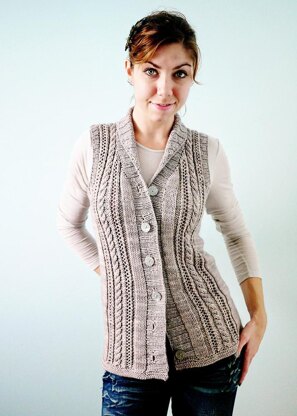 A beautiful cable and lace vest with a close shawl collar for keeping out the cold. A great layering piece for any wardrobe, Gamine does casual or dressy. An engaging knit, without too much fuss, this vest will be ready to wear in no time. This pattern is worked top down beginning with a provisional cast on. The back is worked first and then both front pieces, they are then joined and the body is worked in one piece. The buttonband/collar is worked in one piece. Short rows are used to shape the collar. Both written and charted instructions are included. Size 29.25 [32.75, 36.5, 40, 43.5, 47, 50.5] inch bust measurement, Modeled in size 32.75 with about an inch of negative ease. Materials Madelinetosh 80/10/10 Worsted MCN, 80% superwash merino wool, 10% cashmere, 10% nylon, 187 yards/171 meters, shown in Gossamer - approx. 4 [5, 5, 6, 6, 7, 7] skeins or 720 [800, 896, 976, 1064, 1152, 1232] yards worsted weight yarn. US 7/4.5mm (or size needed to obtain gauge) 24-32 inch circular needle and US 6/4mm 40 inch circular needle. 6 - 7/8