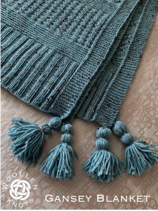 A cozy blanket alternating stitches of the Gansey tradition, with garter panels in-between, so you don't get bored knitting the same pattern over and over! It is edged with a garter border and slipped stitch detail on both sides.