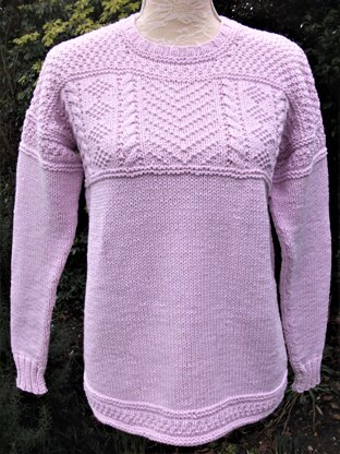 This is an easy fit, pretty, all seasons sweater. The stitch details on this come from the traditional gansey sweaters of fishermen from the North East of England. The design uses certain elements of these on the yoke, and is reflected on the upper sleeves and lower front and back borders. There is also plently of stocking stitch. The sleeves are worked top down so you could slightly alter the length if you wished.